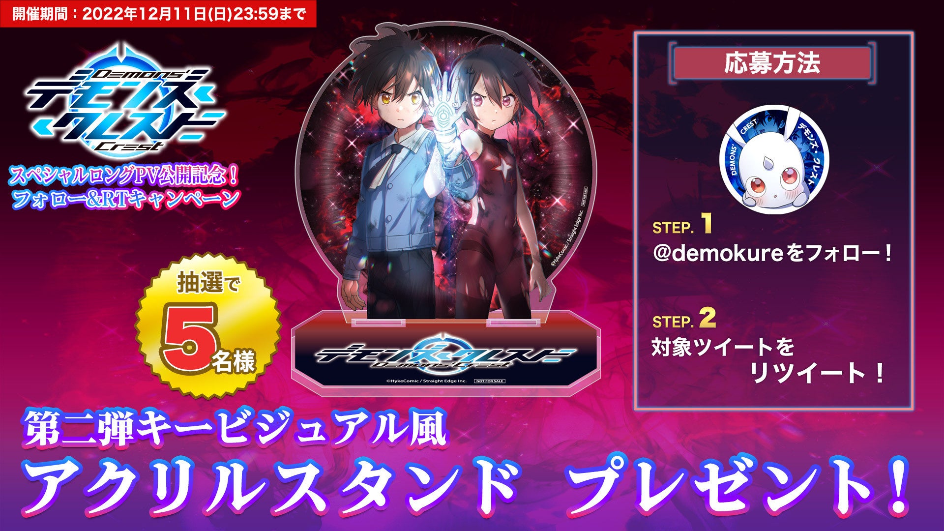 本日2022年11月28日(月)より縦読みフルカラー漫画版『デモンズ・クレスト』公式Twitterで、「『デモンズ・クレスト』スペシャルロングPV公開記念!フォロー&RTキャンペーン」を開催いたします。期間内に『デモンズ・クレスト』公式Twitterをフォローし、該当する投稿をリツイートすることで参加が可能となります。参加者の中から抽選で5名様に、第二弾キービジュアルを使用した特製のアクリルスタンドをプレゼントいたします。